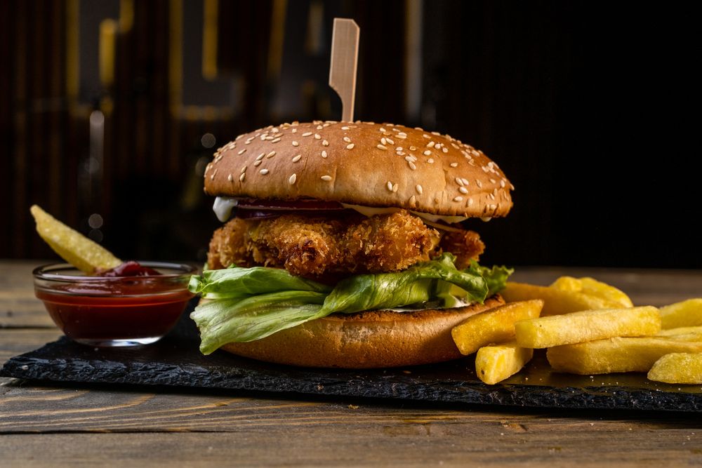Подрумяненная булочка,салат айсберг,томат,красный лук,маринованные огурчики,сыр чеддер,филе тилапии,соус тартар
