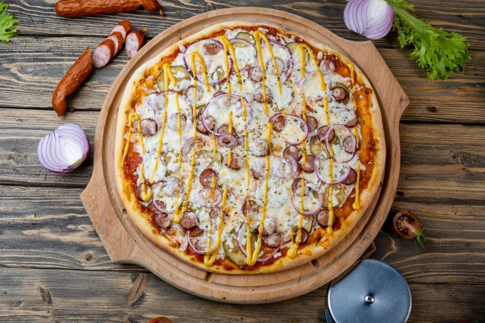 Охотничьи колбаски , малосольные огурцы, дижонская горчица, красный лук,сыр моцарелла