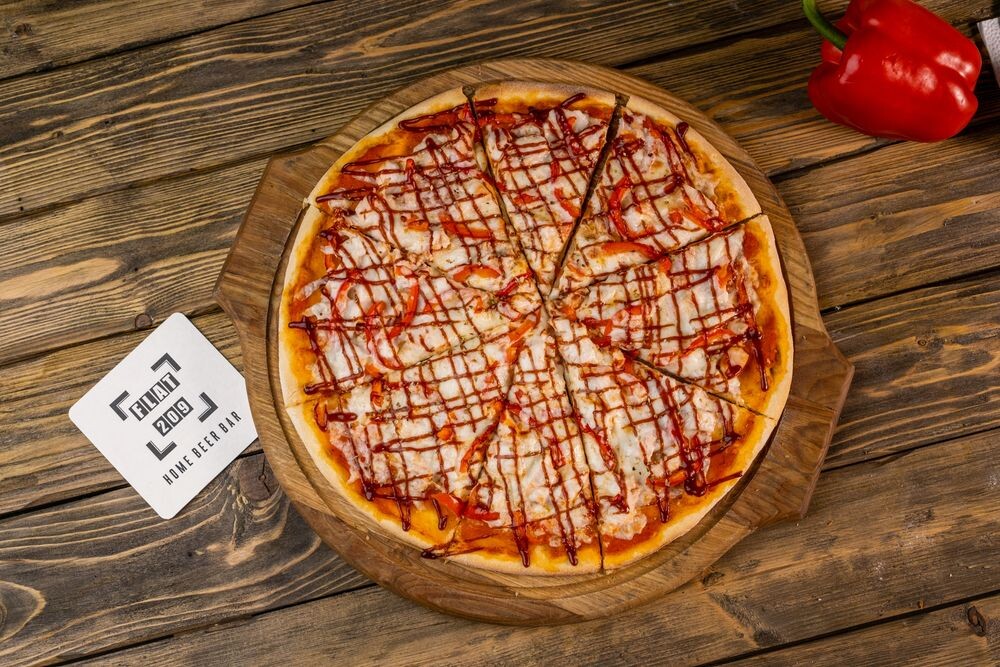 Копченая курица, болгарский перец, сыр моцарелла, соус BBQ