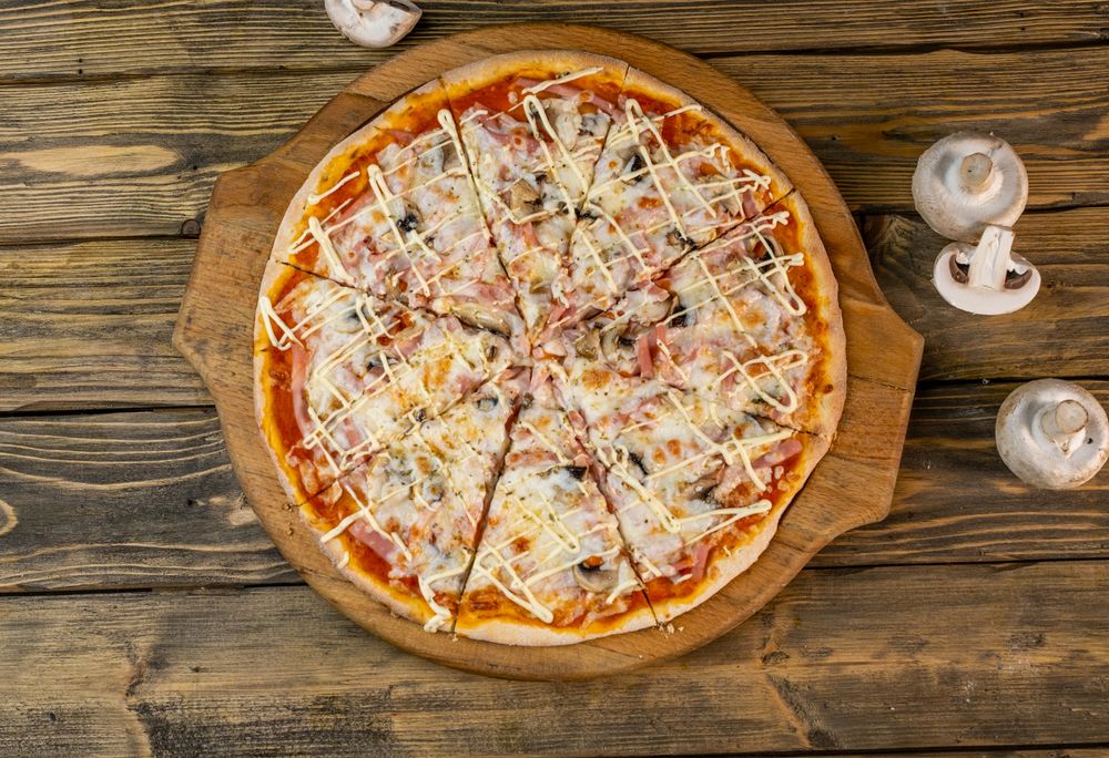 Ветчина, шампиньоны,моцарелла, чесночный соус
